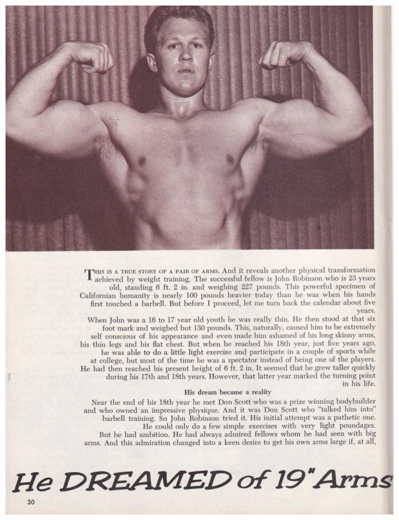 The story of John Robinson and how he put on 100 lbs of muscle whilst building his arms to an impressive 19 1/2″.