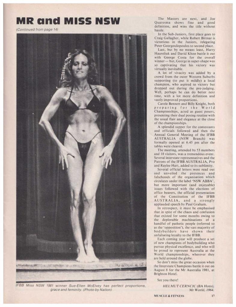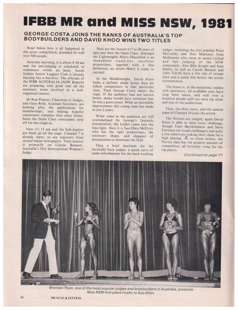 A Contest Report on the IFBB 1981 NSW titles. George Costa would proved too good and win the Open Mens title whilst Sue-Ellen McElvey would win the female crown.