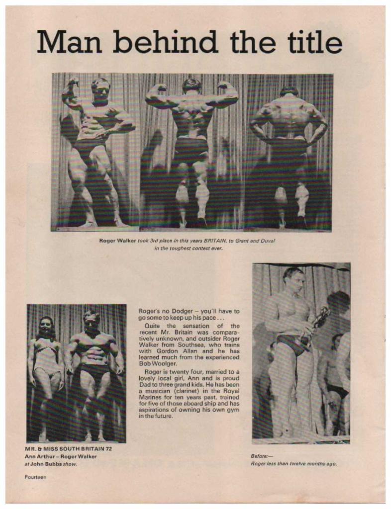In 1972, Roger would win the South East British title by outpointing Johnny Fuller. This victory would qualify Roger for the 1972 NABBA Mr Britain. Roger would finish third in this contest behind Paul Grant and Roy Duval. Two of the premier bodybuilders of the United Kingdom at the time. Completely unknown at the time his star was just about to rise.